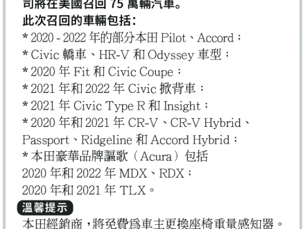 本田(Honda) 將召回75萬輛車