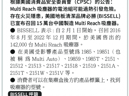 Bissell召回逾15萬台 中國制吸塵器