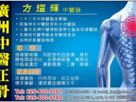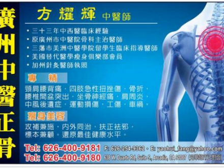 广州中医正骨方耀辉中医师 – Guangzhou Acupuncture & Herbs Yaohui Fang, L.Ac/廣州中醫正骨方耀輝中醫師廣州中醫正骨方耀輝中醫師 (626) 400-9181...