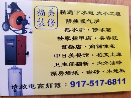 专业暖气,水电 维修。热水炉更换, 下水道疏通(不同不收费) 917-547-3794