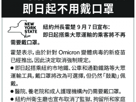 紐約搭乘公共交通工具 即日起不用戴口罩