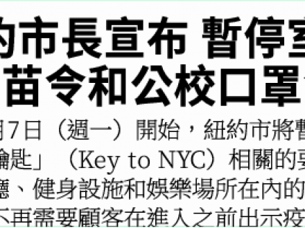 紐約市長宣布 暫停室內疫苗令和公校口罩令