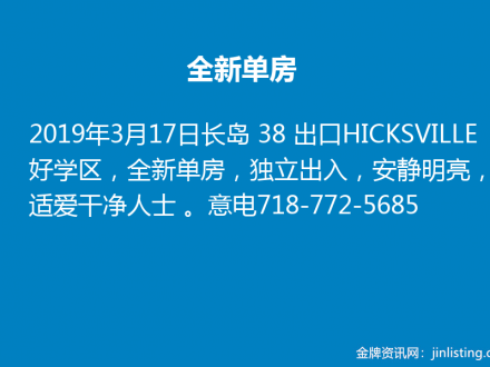 长岛60出囗单房出租 646-642-3888