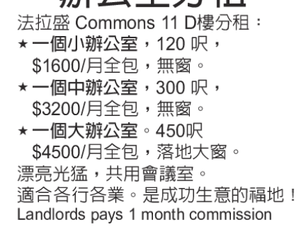 法拉盛办公室出租 flushing Commons 净 310 平方尺 $3250 一个月全部都包进去 包全新家具 桌子跟椅子。 办公室24 小时开放 有24 小时门卫...