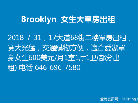 Brooklyn/Bensonhurst 17大道68街 女生大單房出租 646-696-7580