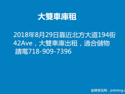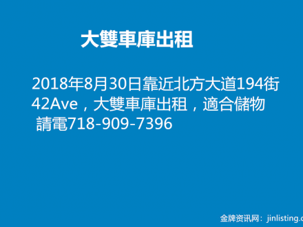 大雙車庫租 718-909-7396