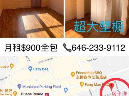 法拉盛敞亮大主卧月租$900全包 临近图书馆