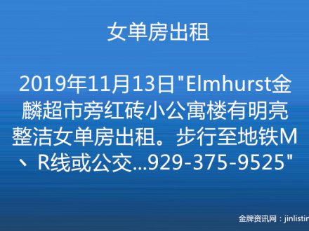 女单房出租 929-375-9525