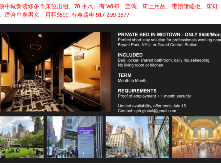 纽约曼哈顿中城 门卫电梯公寓统舱$1995/月包水暖