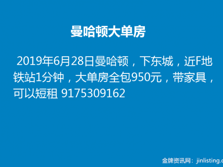 [整房] 曼哈顿金融中心$2800全包,无中介费!