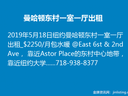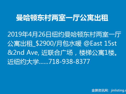 曼哈顿东村两室一厅公寓出租 718-938-8377