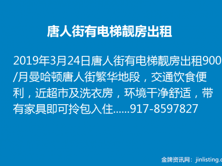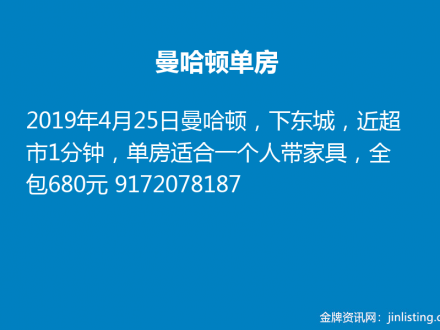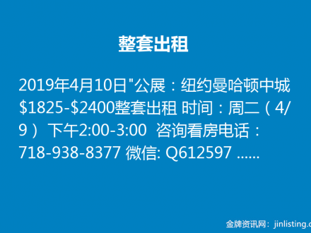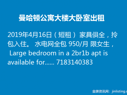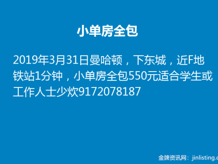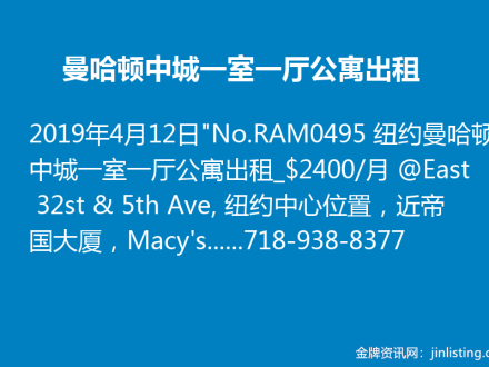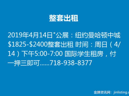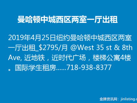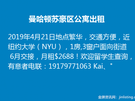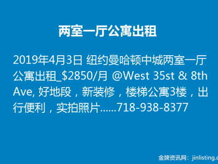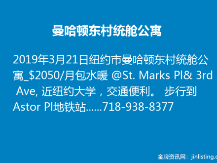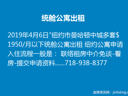 纽约曼哈顿中城统舱公寓出租_$1850/月包水暖电和免佣金