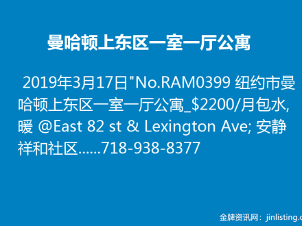 曼哈顿上东区一室一厅公寓 718-938-8377