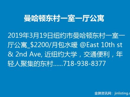 纽约曼哈顿东村两室一厅公寓出租_$2900/月包水暖