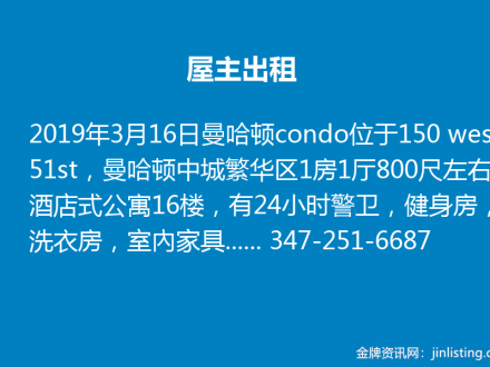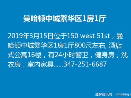曼哈顿中城繁华区1房1厅 347-251-6687
