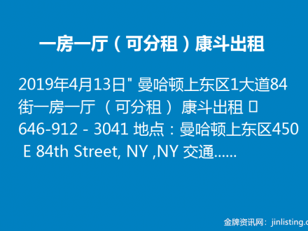 一房一厅(可分租)康斗出租 ️ 646-912-3041