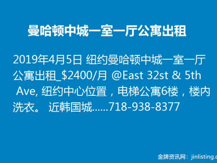 曼哈顿中城一室一厅公寓出租 718-938-8377