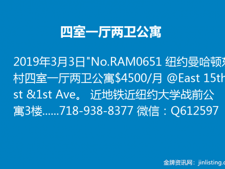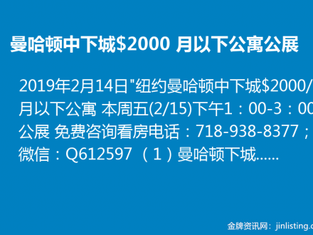 纽约曼哈顿中下城$2000/月以下公寓公展 718-938-8377