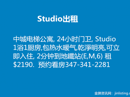 中城电梯公寓 Studio出租 347-341-2281