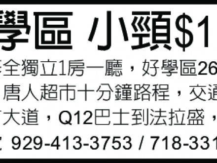 好學区 小颈 全独立一房一廳 718-331-1886