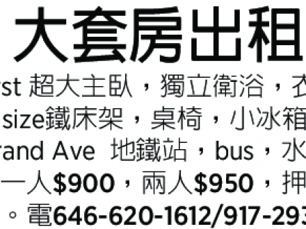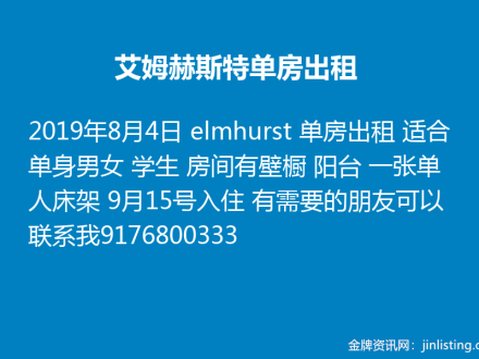 富兰克林和幽宁交界处有单间短期出租、交通便利很安静、干净卫生有网络、家具齐全、房东好说话。单人$30、双人$40,有意者请联系516-343-6785黄女士。...