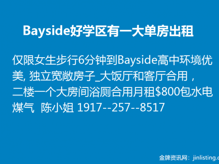 皇后区 Bayside好学区有一大单房出租,仅限女生!!1917-257-8517