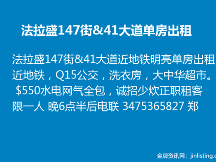 法拉盛147街&41大道近地铁明亮单房出租 $550全包