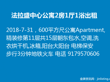 法拉盛中心公寓2房1厅1浴出租 电话 9179570606