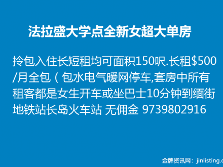 法拉盛大学点全新女超大单房全包随时拎包入住长短租均可 电话】 9739802916