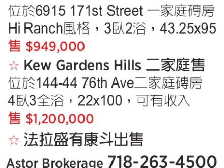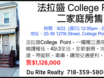 OPEN HOUSE 法拉盛 二家庭房售 718-359-5800