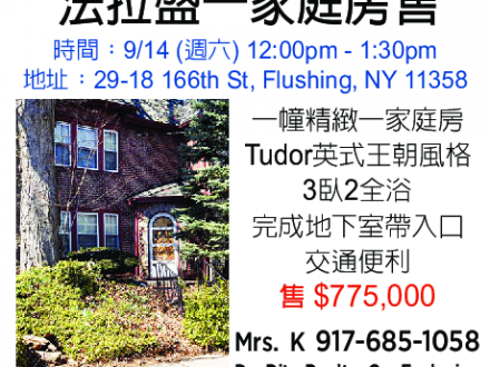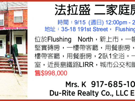 公展:法拉盛二家庭房售 917-685-1058 718-359-5800