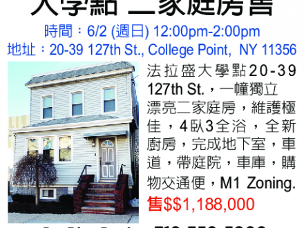 OPEN HOUSE – 法拉盛 College Point 二家庭房售 718-359-5800
