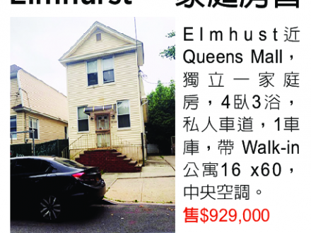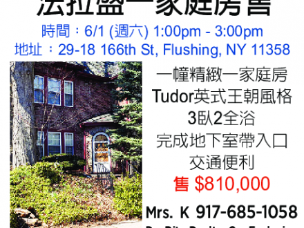 OPEN HOUSE – 發拉盛一家庭房售 917-685-1058 718-359-5800