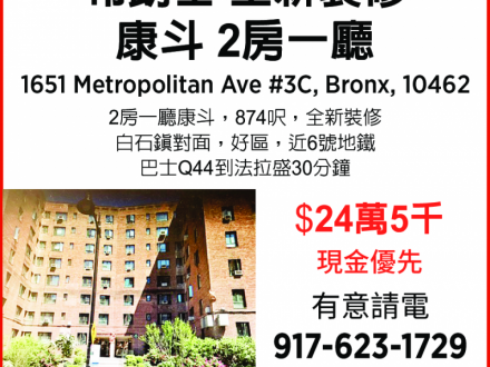 布朗士 康鬥2房一廳 917-623-1729 917-717-8900
