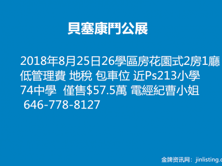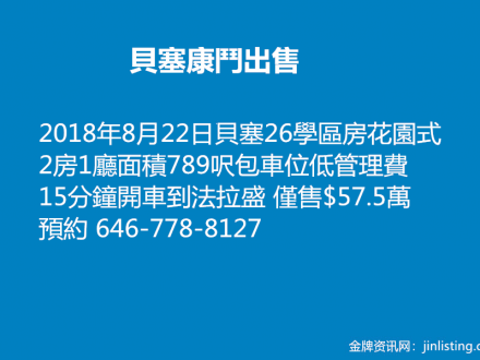 貝塞康鬥2房1廳 售$57.5萬 646-778-8127