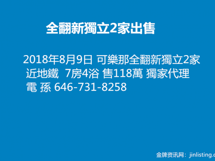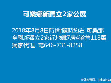 可樂娜全翻新獨立2家 售118萬 646-731-8258