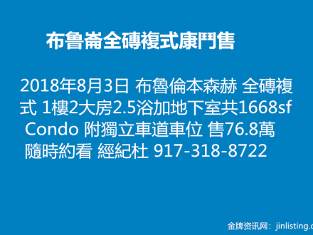 布鲁崙全磚複式康鬥售76.8萬 917-318-8722