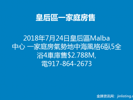 3房2浴 FreshMeadow 售:$665,000 电话: 9175957200