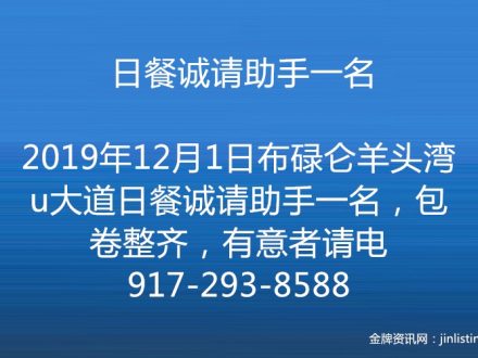 日餐诚请助手一名 917-293-8588