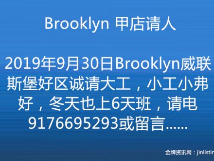 Brooklyn 甲店请人 9176695293