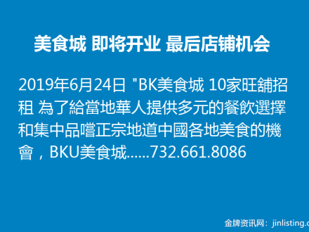 美食城 即将开业 最后店铺机会 732.661.8086
