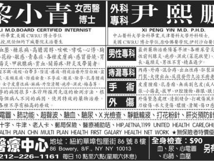 • 华埠时代医疗中心(尹熙鹏 医学博士、黎小青 医学博士)212-226-1161