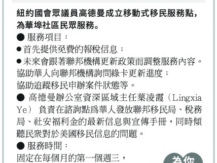 紐約國會眾議員高德曼 華埠設移動式移民服務點