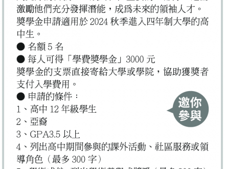 「未來亞裔領導力獎學金」 申請截止日期:4月15日