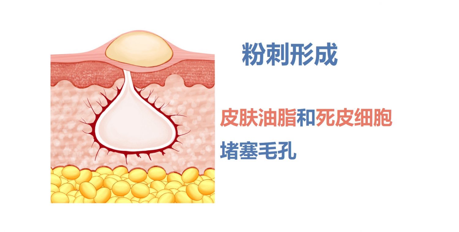 粉刺具体形成的过程是:死皮细胞被皮肤油脂粘在一起,导致毛孔堵塞;然后皮肤上出现黑头或白头;细菌在毛孔中繁殖导致皮肤发炎,最后皮肤出现脓疮、红肿的问题。