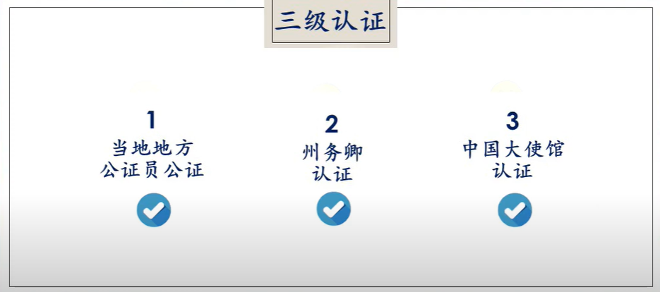 - 最后,由中国驻美国使馆对州务卿认证的文书进行证明Legalization(即第三级认证)。